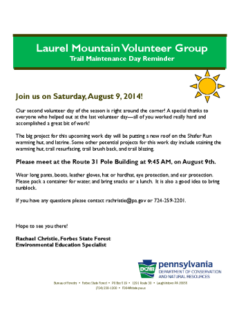 We will be meeting at the Route 31 Pole Building at 9:45AM to begin work at 10AM. The pole building is located off of Route 31, near Camp Run Road (about 5 miles past the 381/711 intersection, heading east towards Hidden Valley). Please see the flyer for more details.