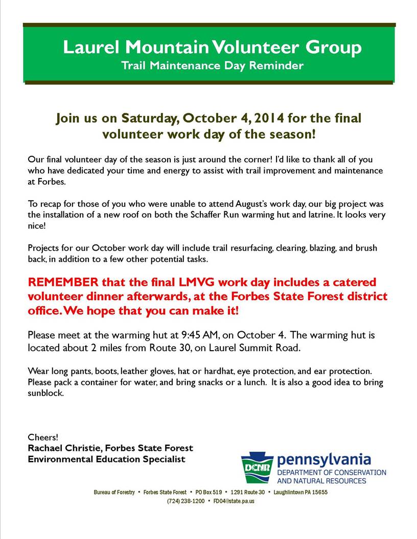 This is the last volunteer day for the season. Projects will include trail maintenance, resurfacing, blazing and brush back. See the flyer for more details (click to enlarge).