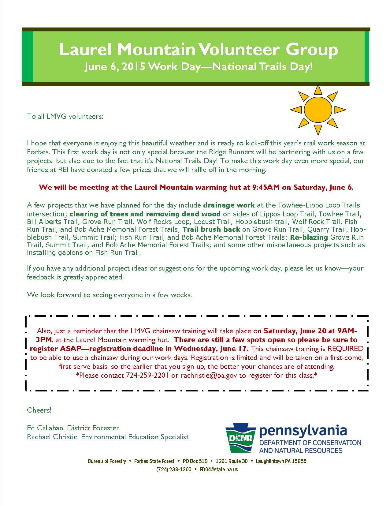 Laurel Mountain Volunteer Group work day - National Trails Day w/ the Ridge Runners - meet at Laurel Mt warming hut at 9.45am on Saturday 6 June.