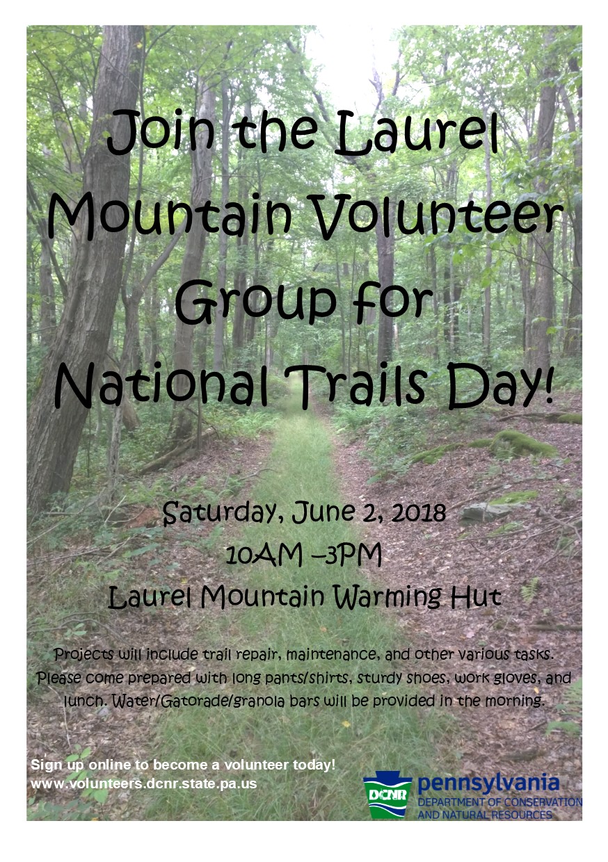Our first volunteer day of 2018 is quickly approaching - We invite you to come out to Forbes State Forest on Saturday, June 2, 2018 for National Trails Day! We will be meeting at the Laurel Mountain Warming Hut, located off of Laurel Summit Road.
