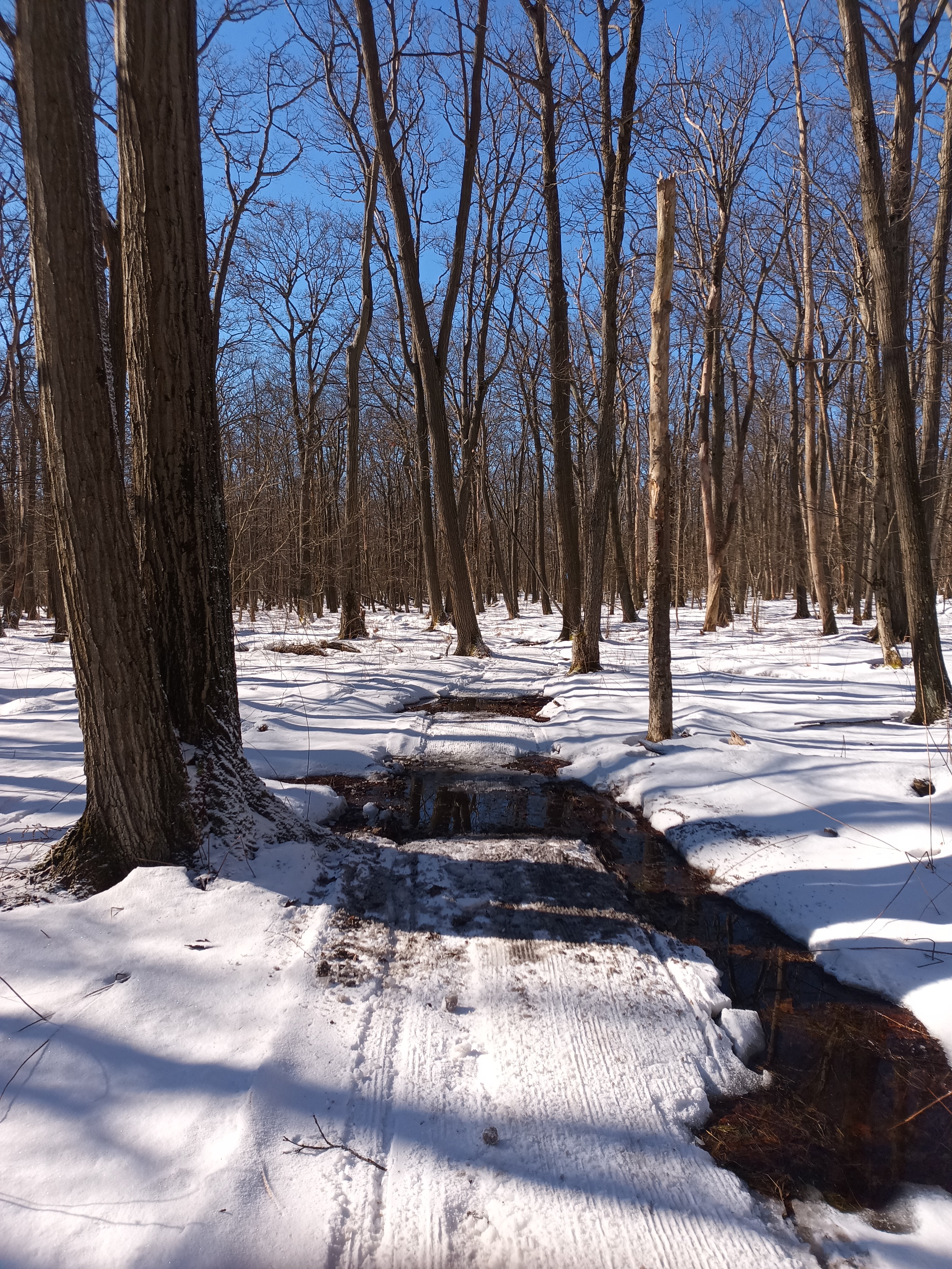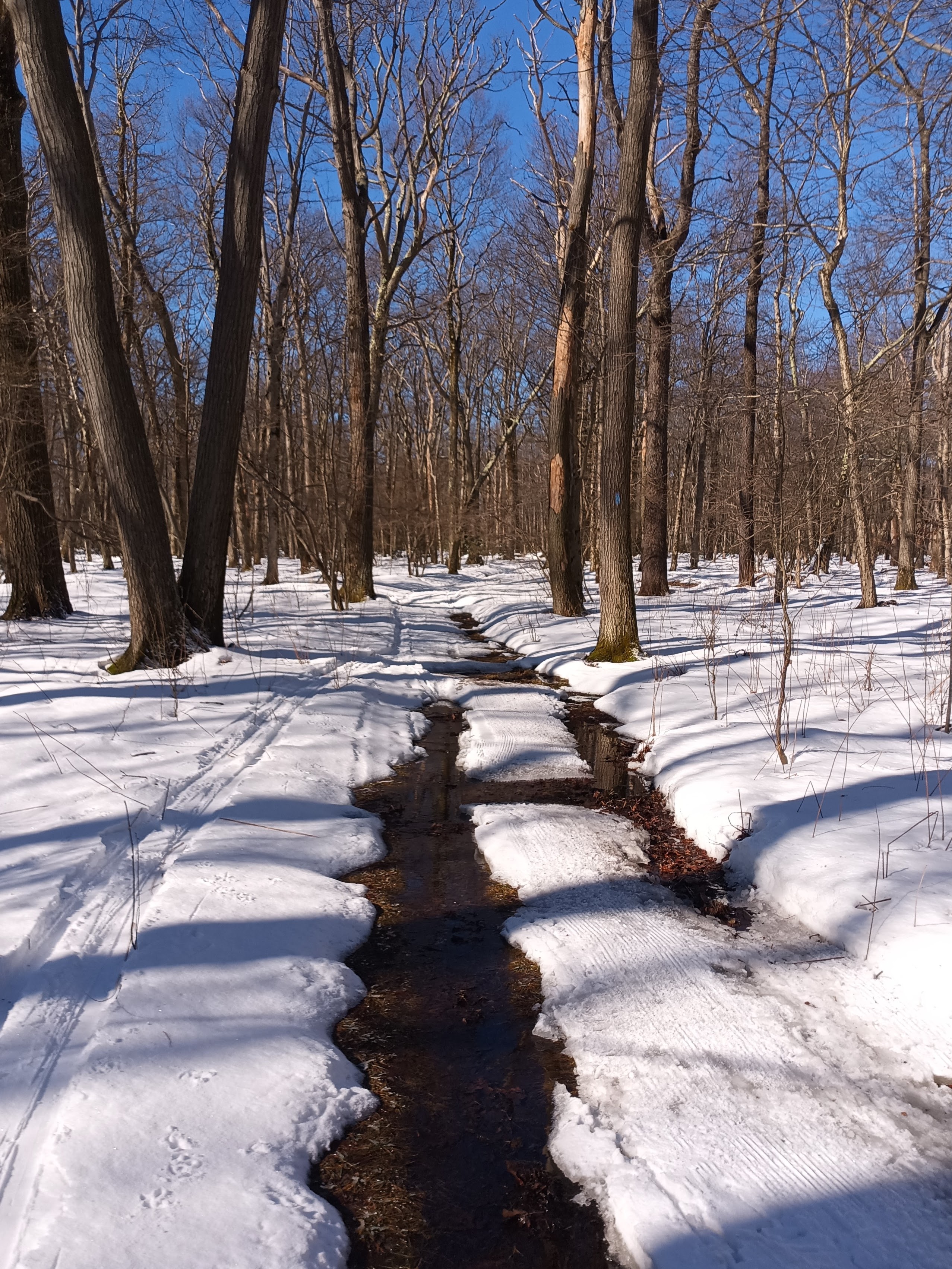 Unfortunately there are several long stretches of trail (Towhee and Lippo's Loop) where the snowpack has been washed away by water sitting or flowing underneath the snowpack, or flowing along the trail beside the snowpack. It's not possible to make a continuous loop for the race course without going off trail through the trees, and the trail isn't wide enough to make an out-and-back. It seems unlikely that it could be fixed by moving chunks of snowpack from the woods onto the trail. The race has been cancelled, and we're not going to use the backup date as the forecast is bad midweek.