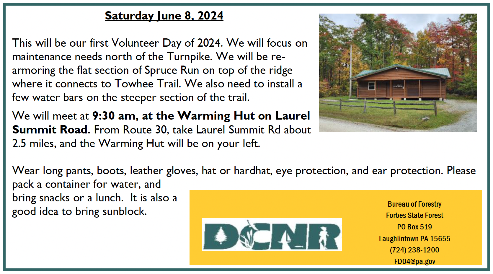 Wear long pants, boots, leather gloves, hat or hardhat, eye protection, and ear protection. Please pack a container for water, and bring snacks or a lunch and sunblock. Also, please register as a DCNR conservation volunteer if you have not already done so.