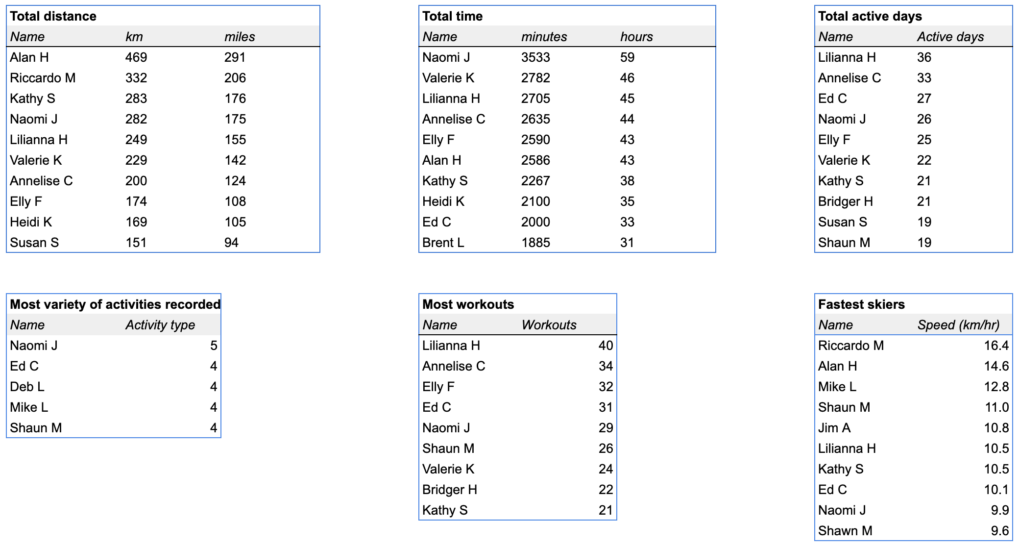 The screenshot shows a variety of leaderboards; the overall leaders in distance were Alan Hough (469 km) and Kathy Schreckengost (283 km) and between us we skied 4481 km. From the youth skiers, the girls' and boys' distance leaders were Lilianna Hug (248km) and Matthew South (114km) in the 11-16y age group, and Kaylin Atkinson (38km) and Bridger Hug (112km) in the 6-10y age group.