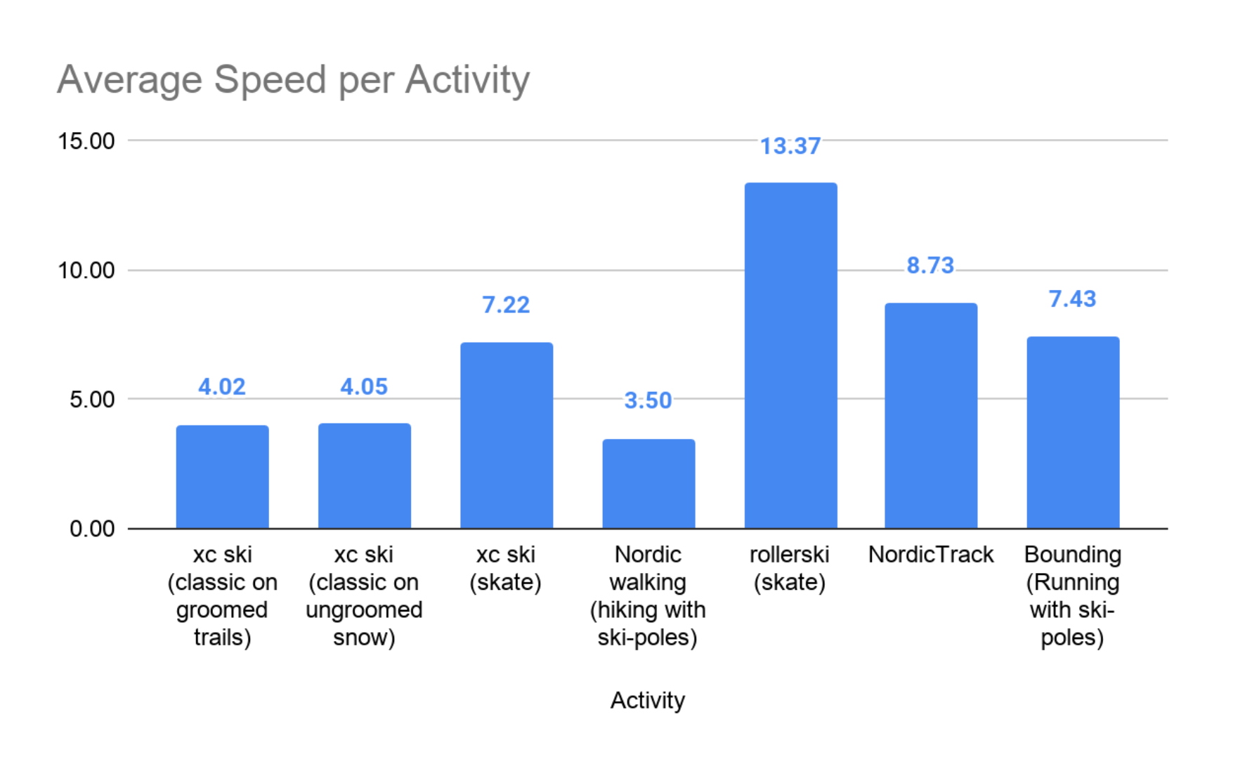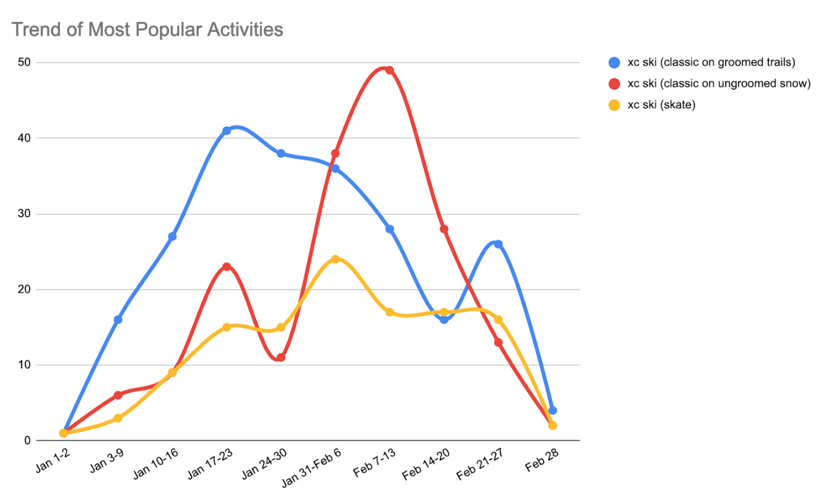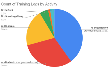 Alan Hough skied the furthest in one go (53km, classic), just 7km further than Riccardo Monaco (46km, skate), while Naomi Jarvis skied for the longest in one go (6.5h, 31km from Saltsburg to Conemaugh Dam and back on untracked snow over ice over snow, the hills were really fun). Lilanna Hug recorded more workouts (40) on more days (36) than anyone else; the runner up was Ed Cook with 31. Over 90% of the activities were skiing outdoors on snow, as we were extremely fortunate with the fantastic winter weather.