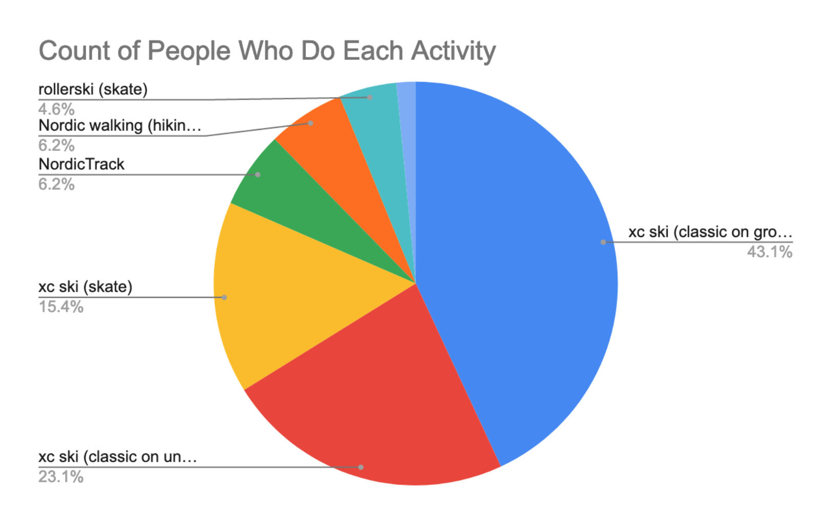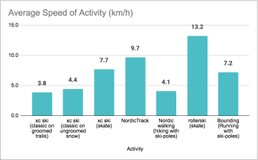 A closer look at the data reveals that by far most of the activities involved snow, this is what we dreamed of but never dared to hope for, and the most popular activity is classic skiing on groomed trails. So far, only one person resorted to running with poles, and another 3 went rollerskiing. The speed charts show that rollerskiing is considerably faster than the other activity averages (most probably the rollerskiers), and that the Nordic walkers travel faster than the average classic skier on a groomed trail.