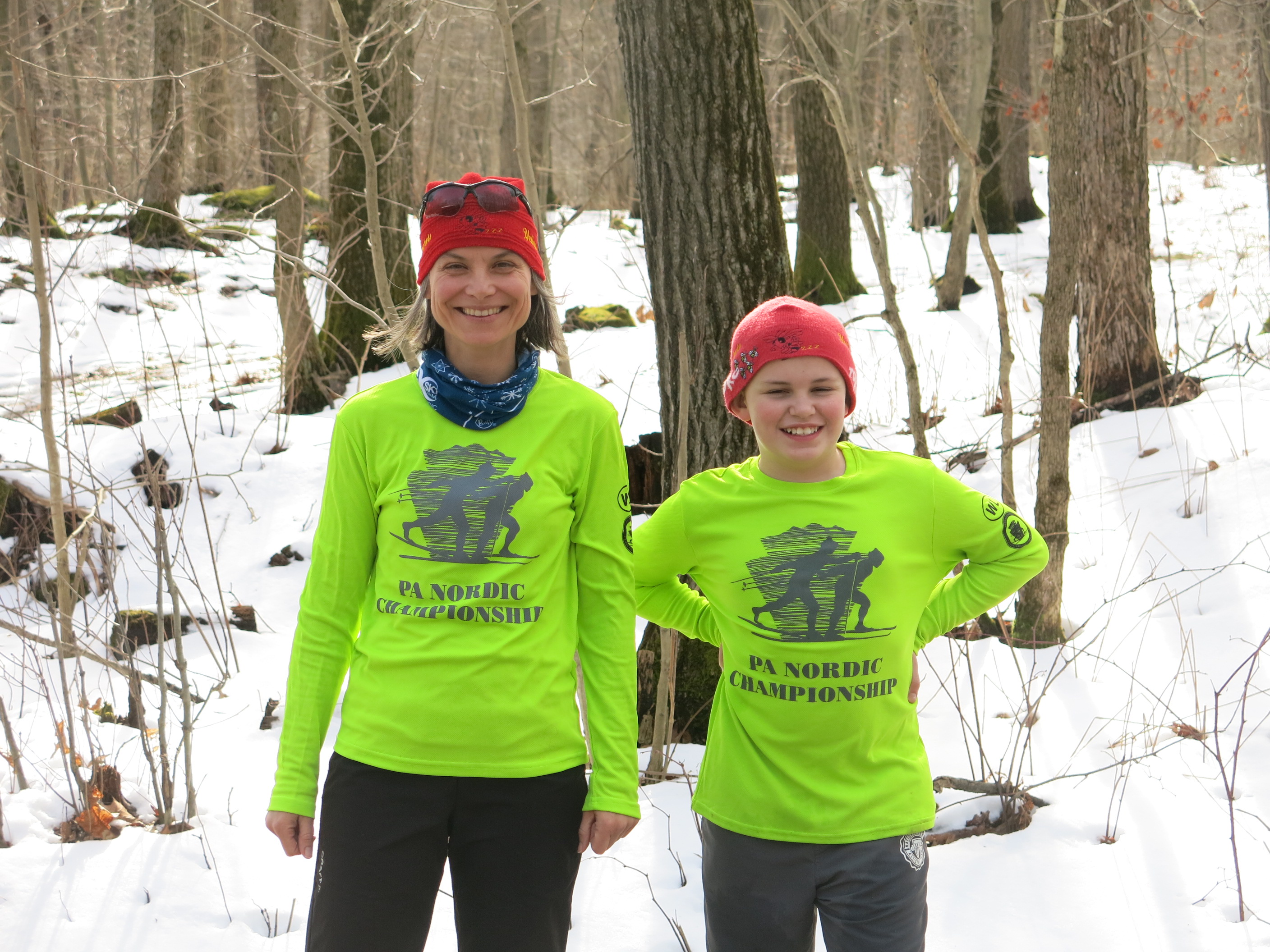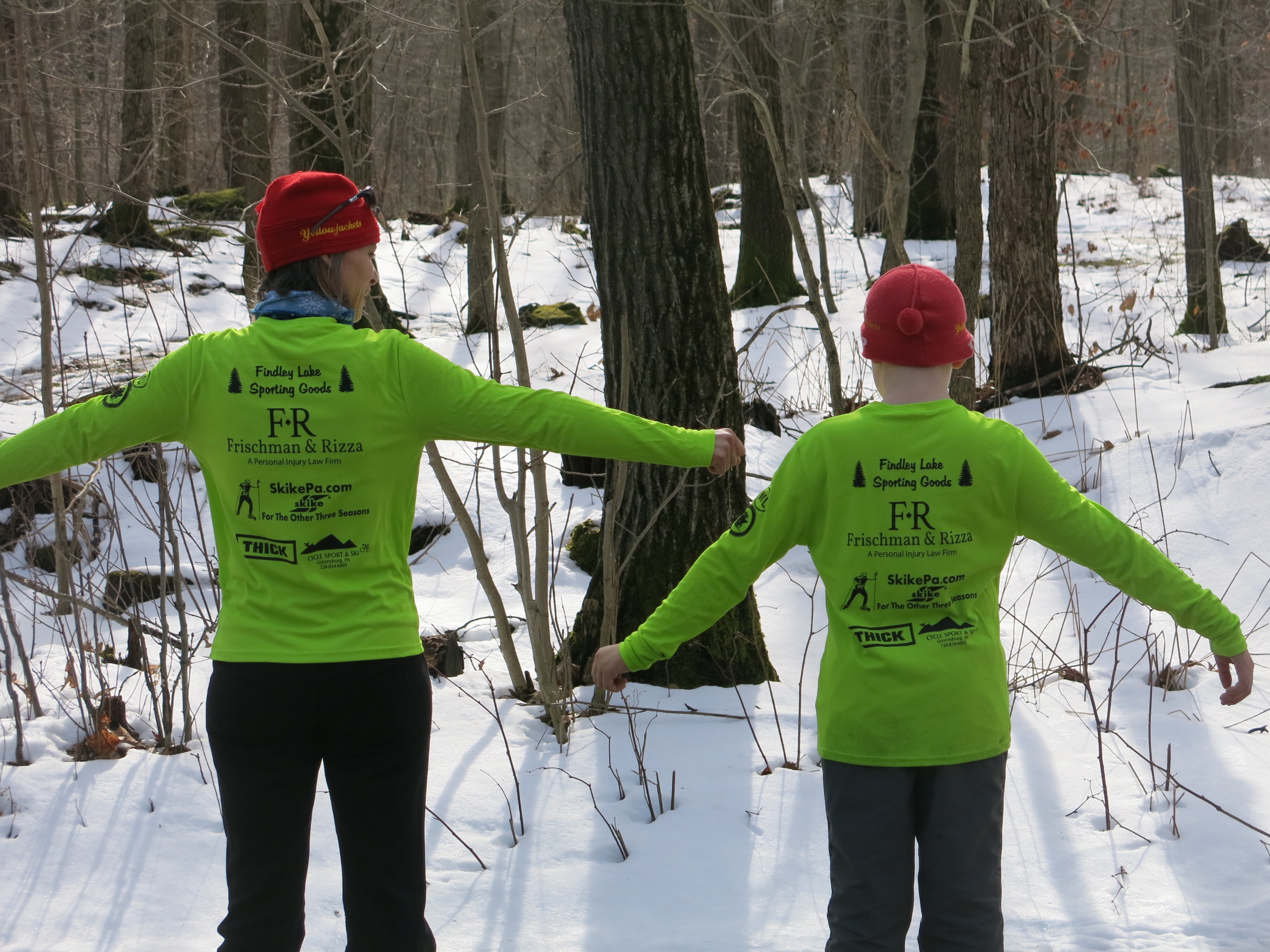 We have some extra race shirts available for $15 each in sizes S to XL.   They are lightweight, tech wicking fabric, and a nice high visibility green which will stand out in traffic - ideal for rollerskiing or cycling etc.  Here we have Naomi and Matthew modelling size S.  If you'd like a shirt, contact Jim.