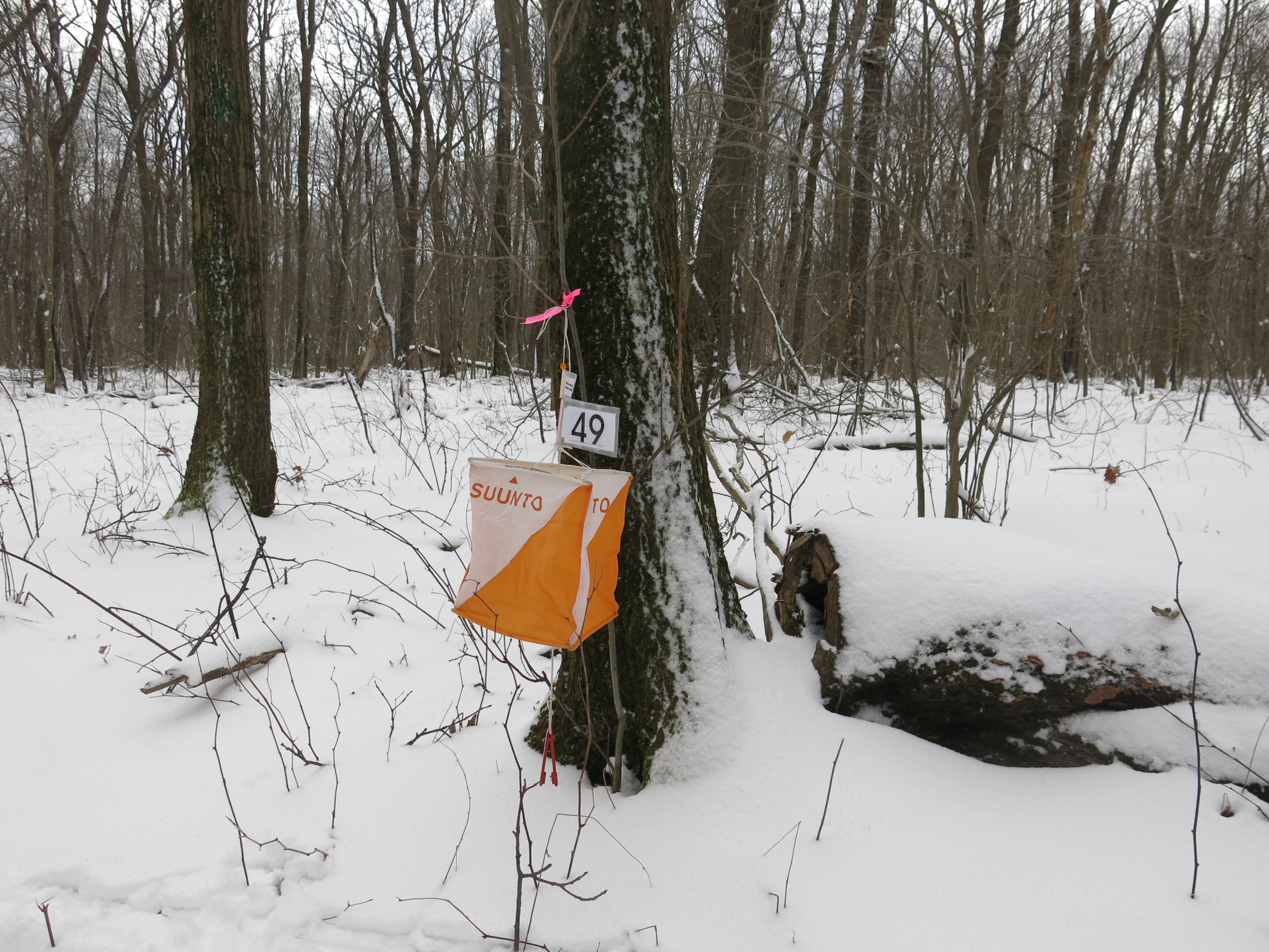 The participants carry either a control card, which they stamp with the punch hanging beneath each control to prove that they have visited it, or (not in winter) an electronic equivalent. The control flags are never actually hidden, but are often out of direct line of sight, and are always hanging on or next to some kind of landscape feature, eg in a pit, behind a bush, at a spring or a trail junction. In ski-O the skiers are not expected to travel off-trail, so there is no bush-whacking, hopefully no mud, no sticky plant seeds, most of the features will be trail junctions (definitely no pits!) and the orange flags are visible from some way off, so you can concentrate on your route choice and skiing.