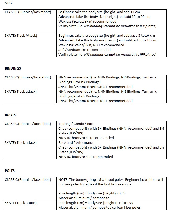 The Bunny group (5-6 years old) skis without poles, which allows them to develop proper balance skills on skis. Younger Jackrabbits (7-10 years old) will also ski without poles for at least the first few sessions. When the older kids join the Track Attack skate group (10-16 years old), they will also need a set of skate skis and skating-length poles. We also recommend "combi" style boots for Track Attack, which can be used for both skate and classic classic skiing.